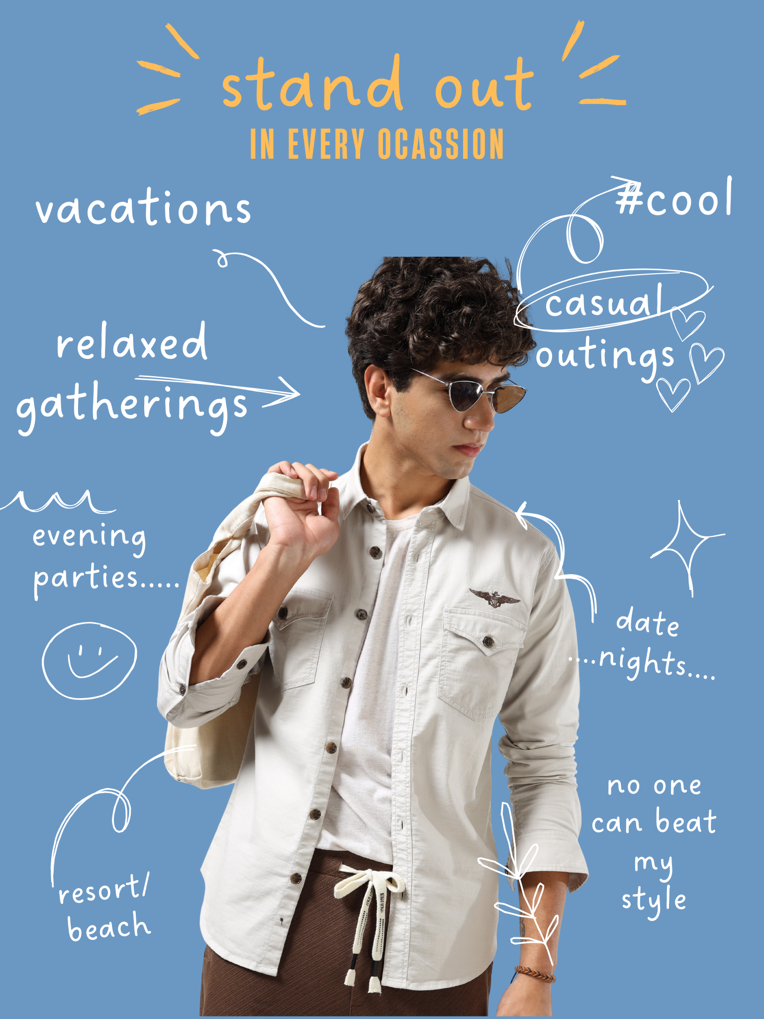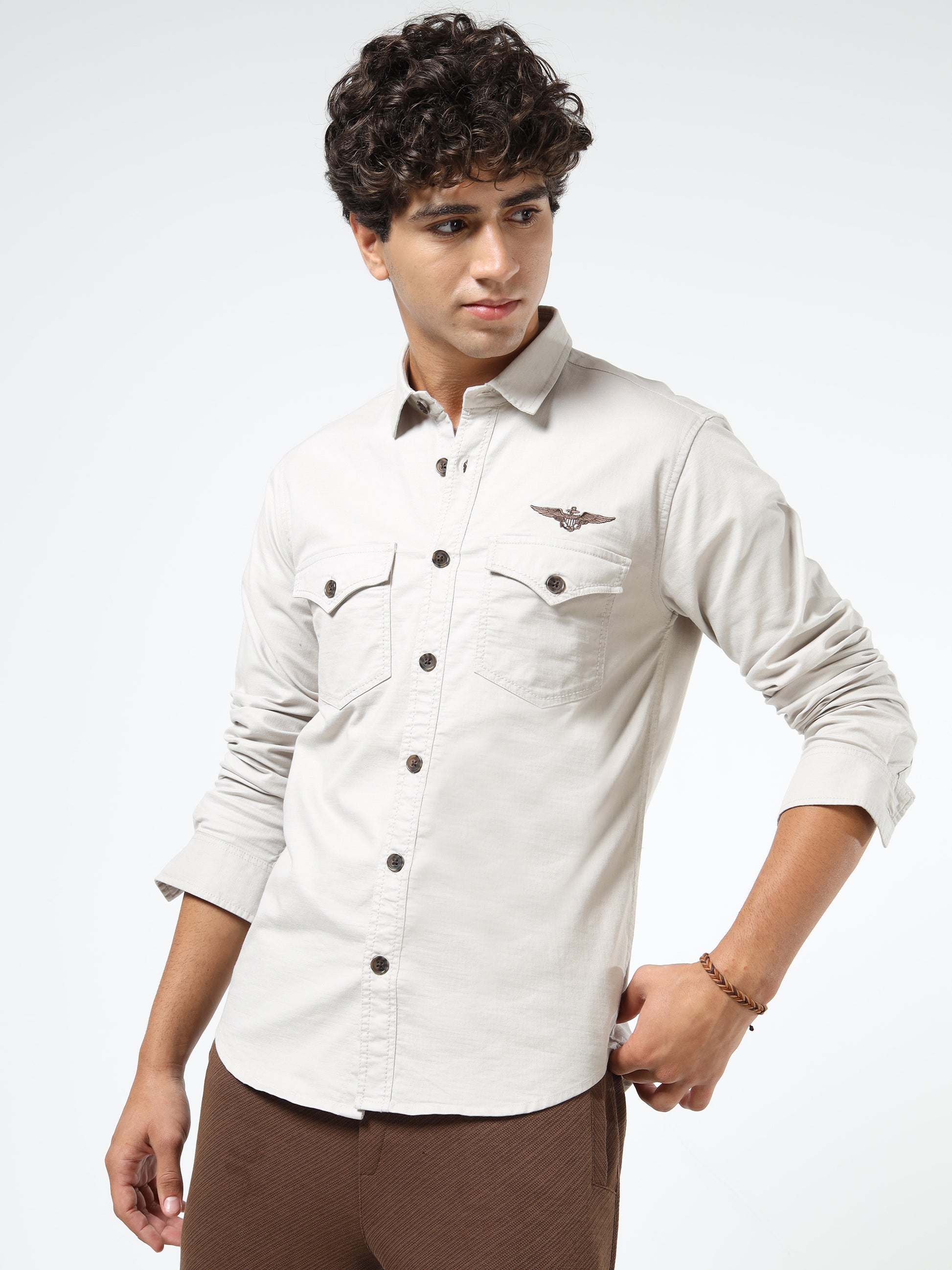 Men’s Beige Cotton Utility Casual Shirt with Dual Flap Pockets