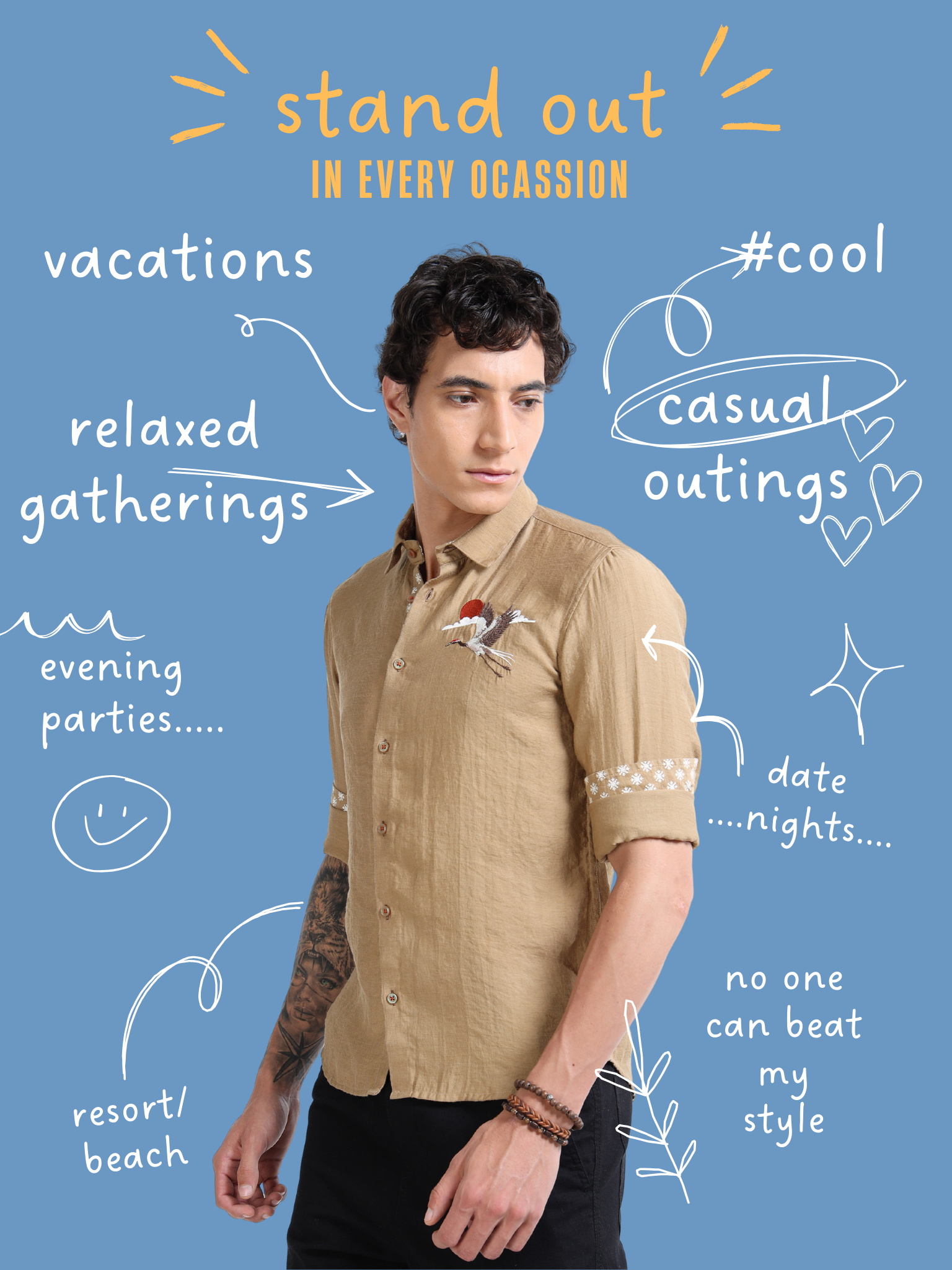 Men’s Beige Textured Cotton Casual Shirt with Crane Embroidery & Contrast Detailing