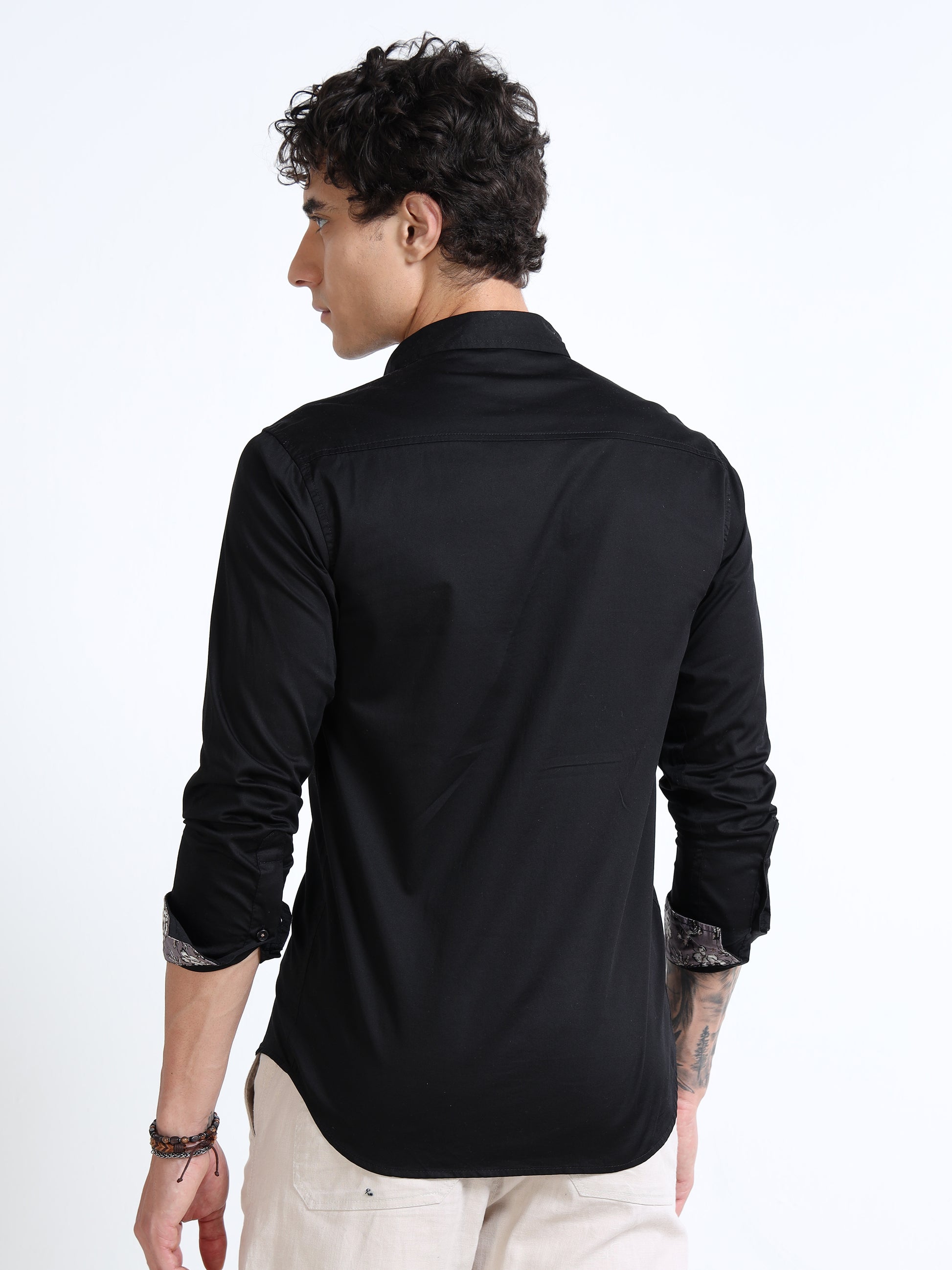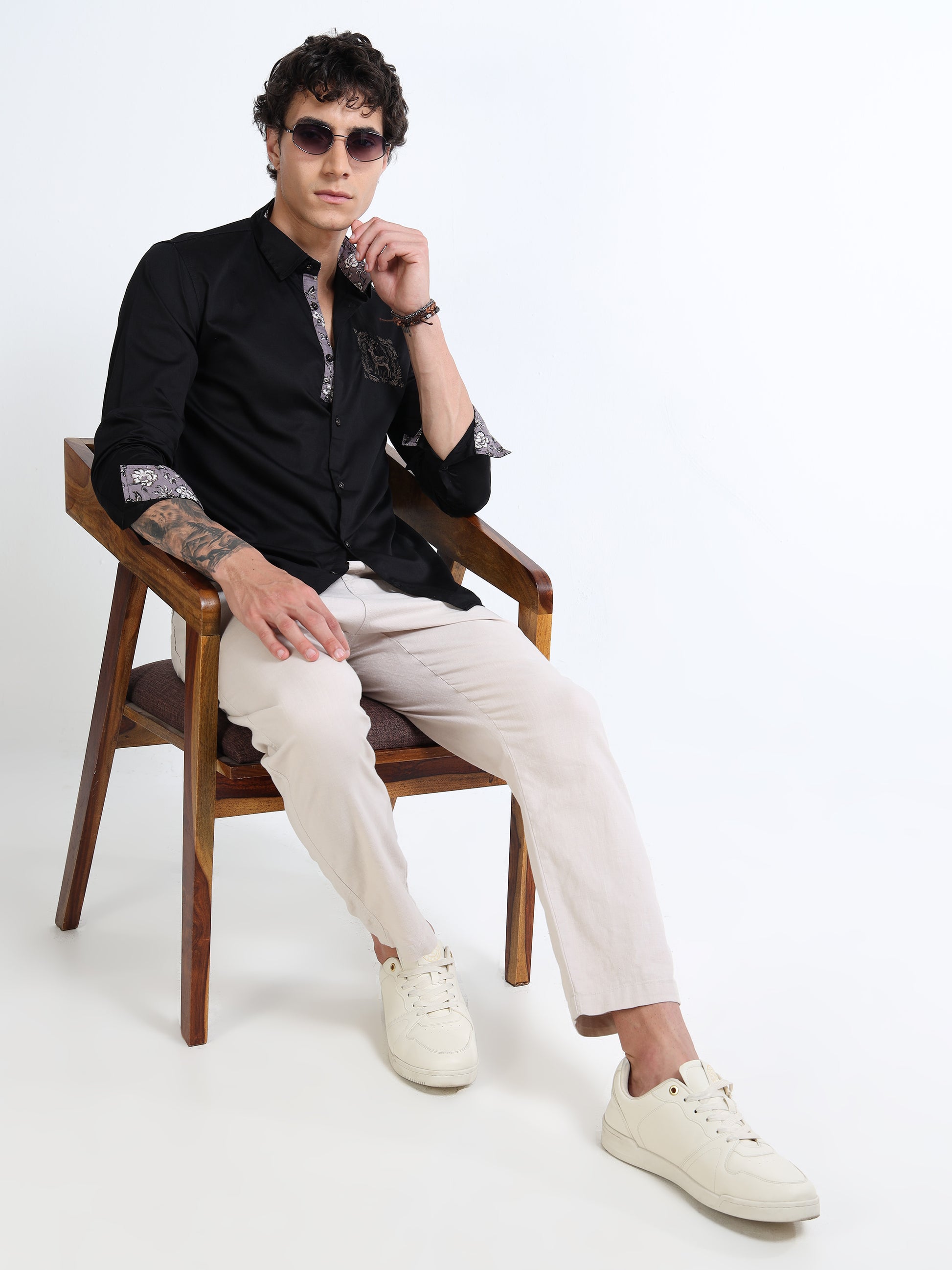 Men’s Black Cotton Casual Shirt with Embroidered Deer Detailing
