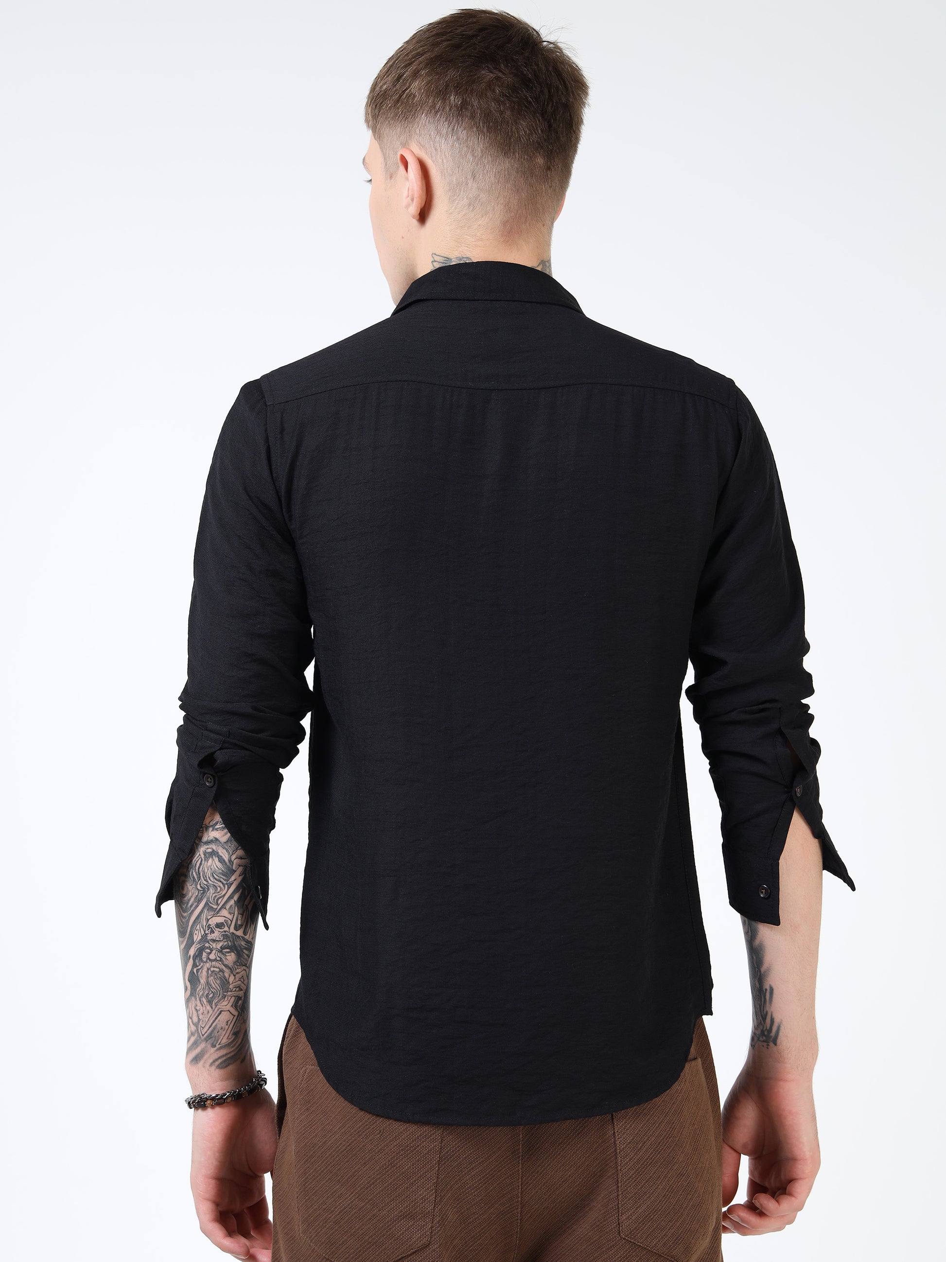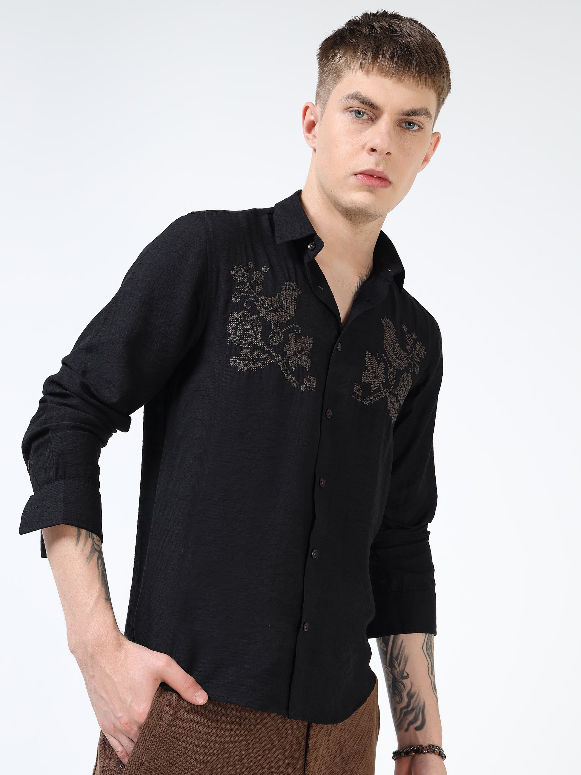 Men’s Black Textured Cotton Casual Shirt with Bird Embroidery Detailing