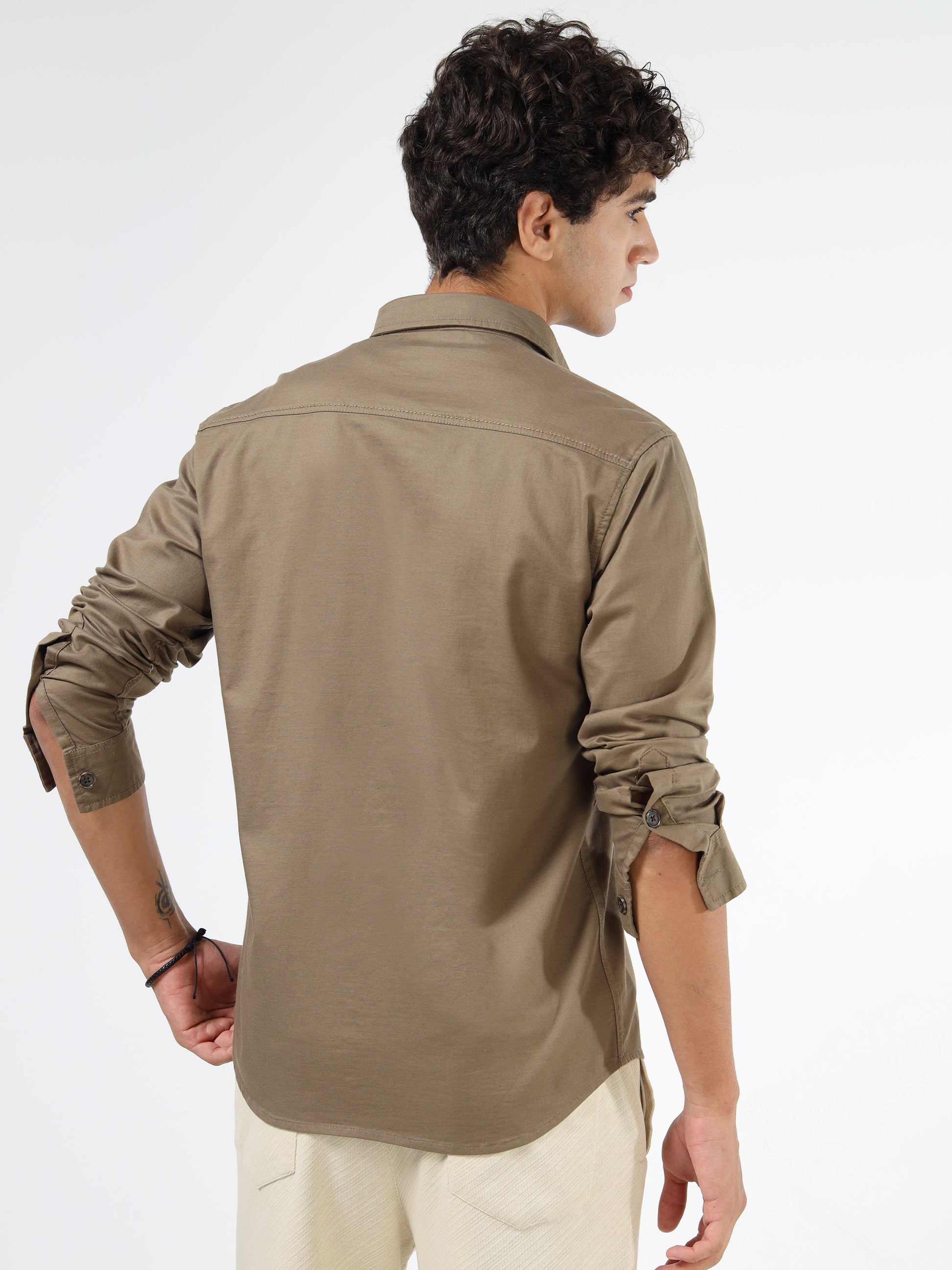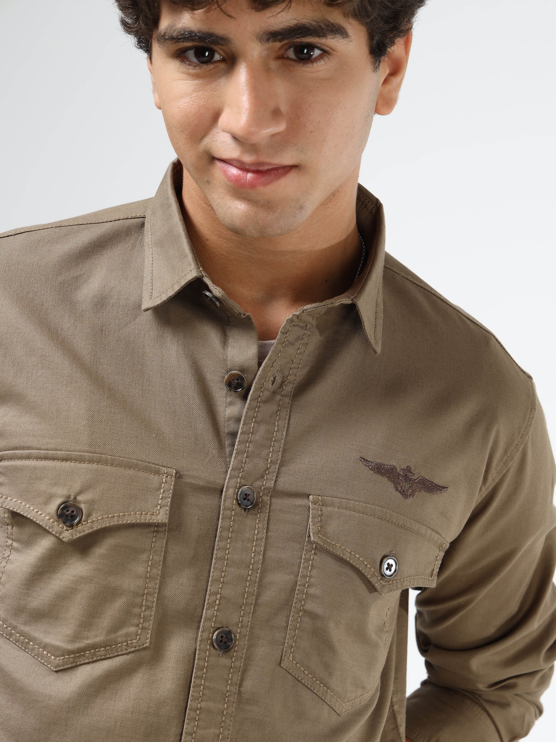 Men’s Brown Cotton Utility Casual Shirt with Dual Flap Pockets