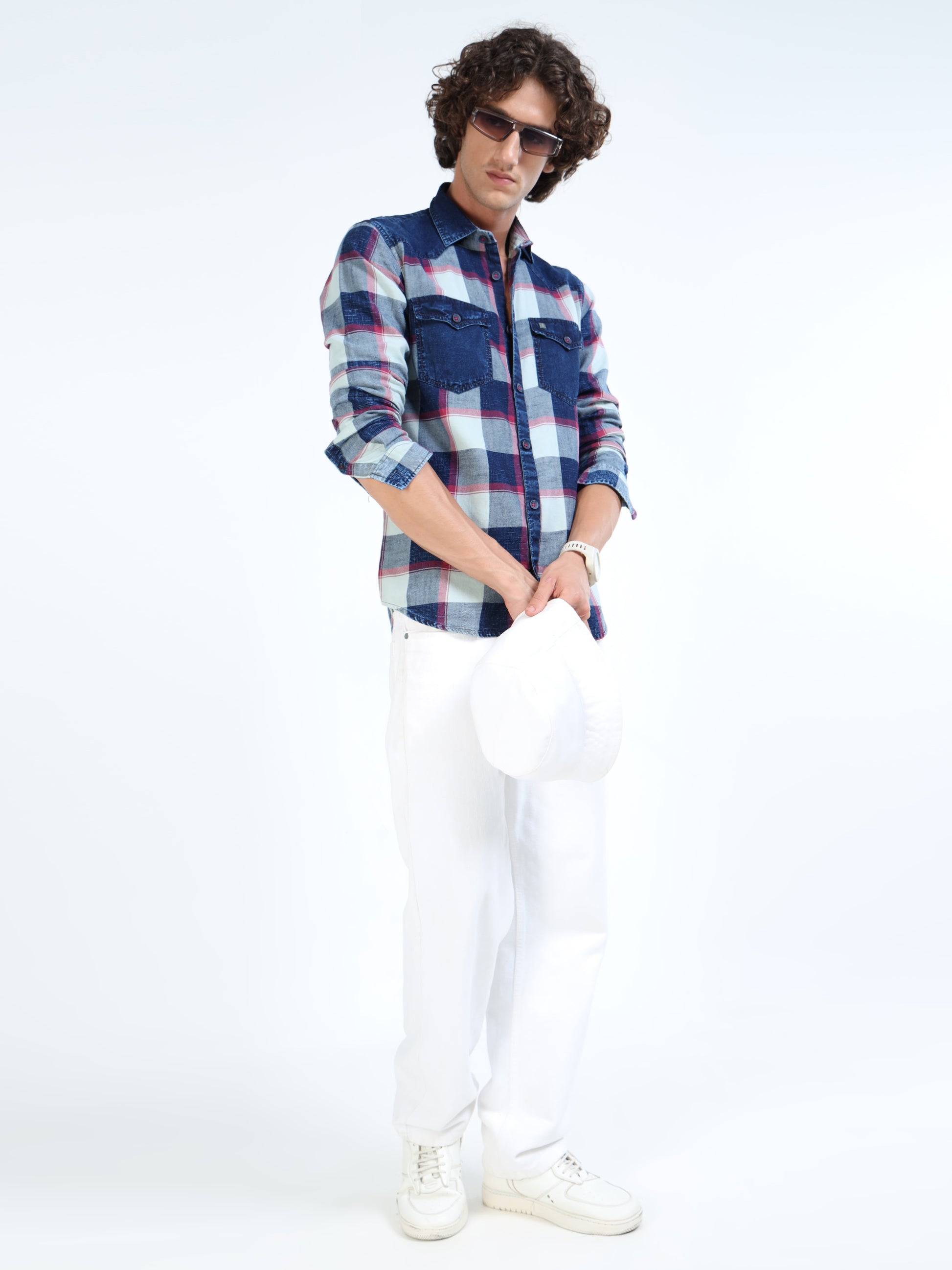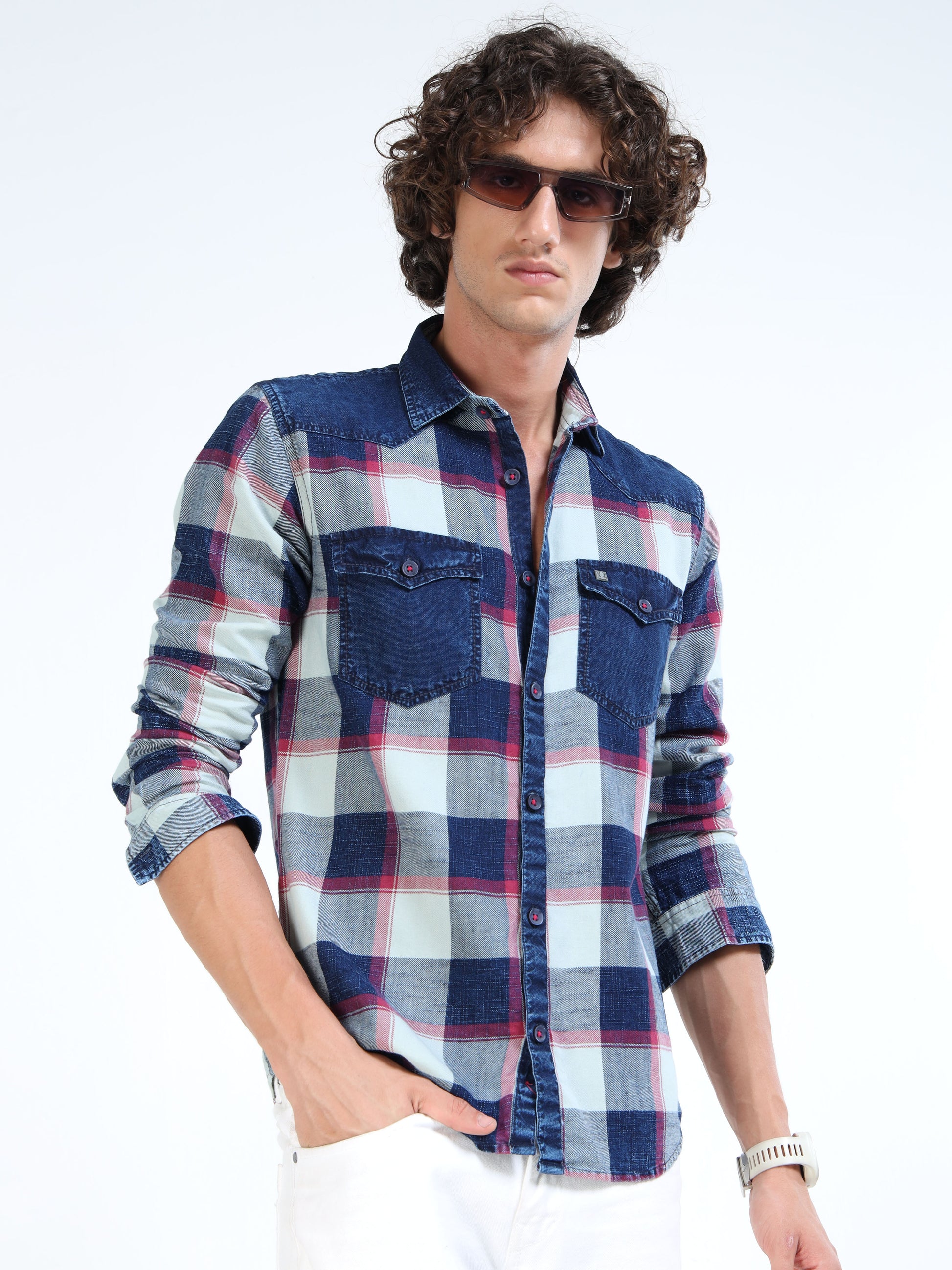 Men’s Indigo Blue Plaid Denim Cotton Utility Shirt with Dual Flap Pockets