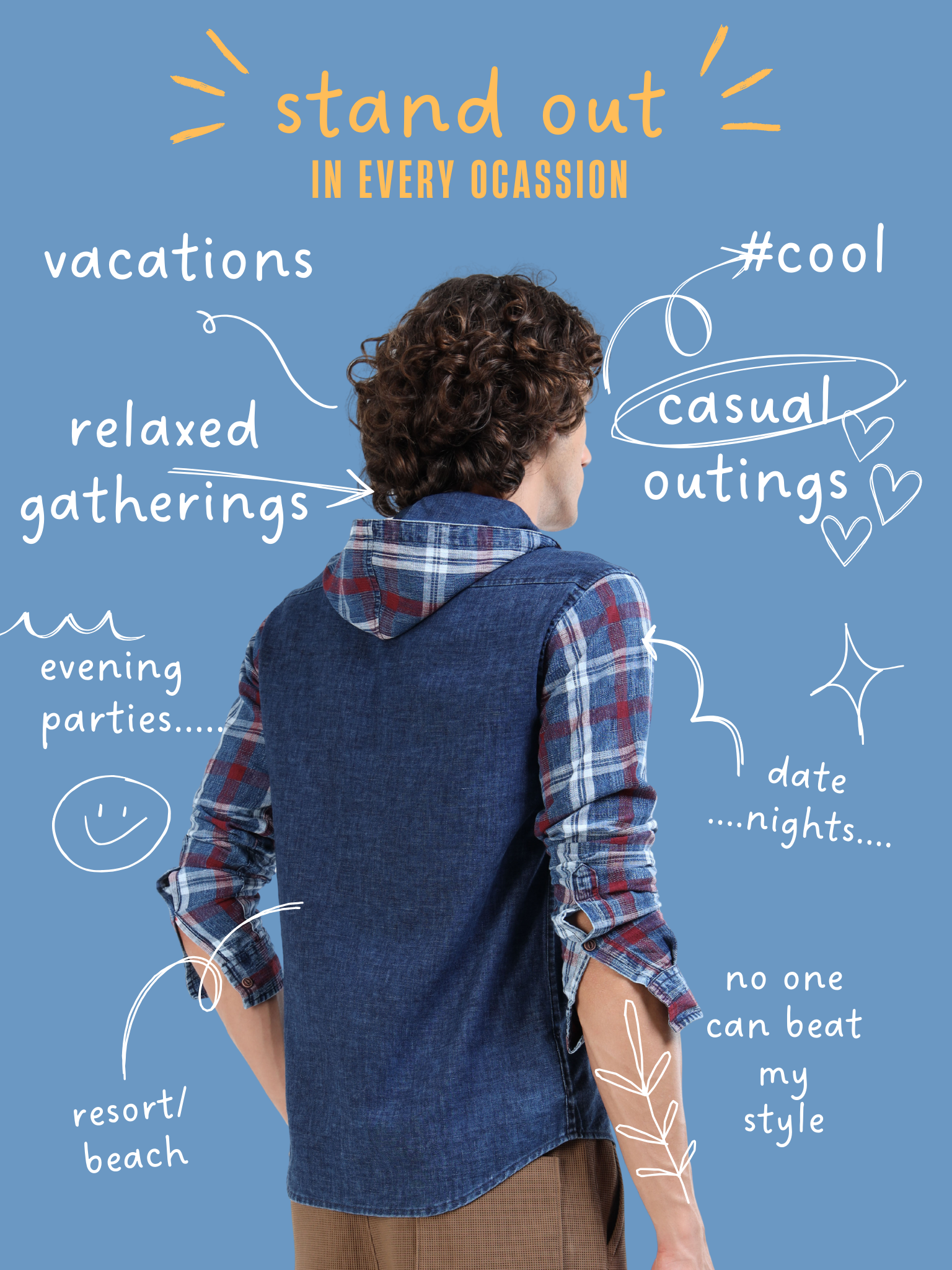 Men’s Indigo Denim Cotton Shirt with Plaid Contrast Sleeves and Half Placket