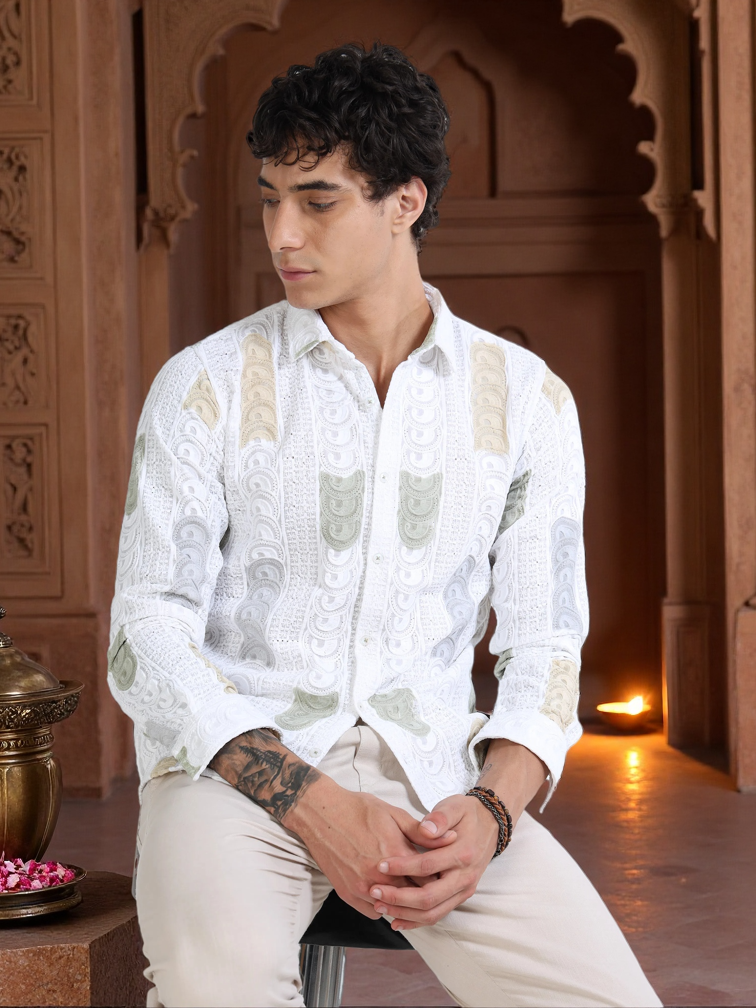 Men’s White Multicolor Embroidered Cotton Shirt with Textured Detailing