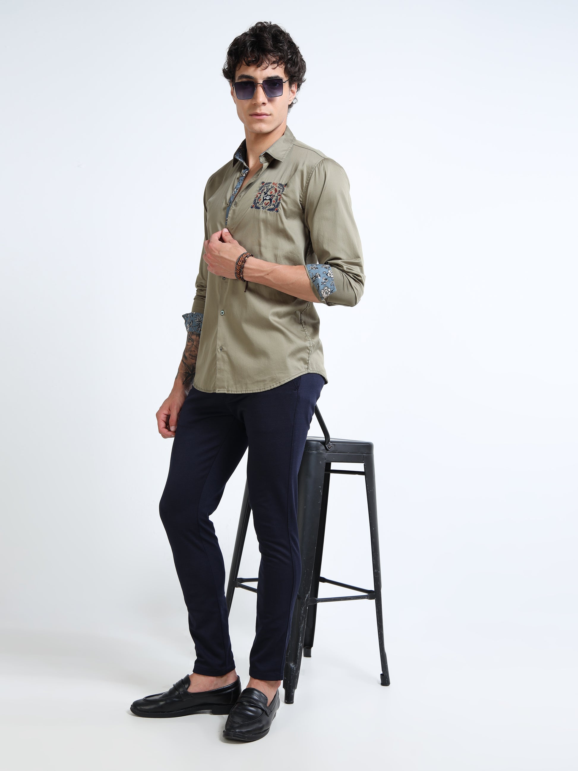 Men’s Olive Green Slim-Fit Shirt with Embroidered Stag Motif