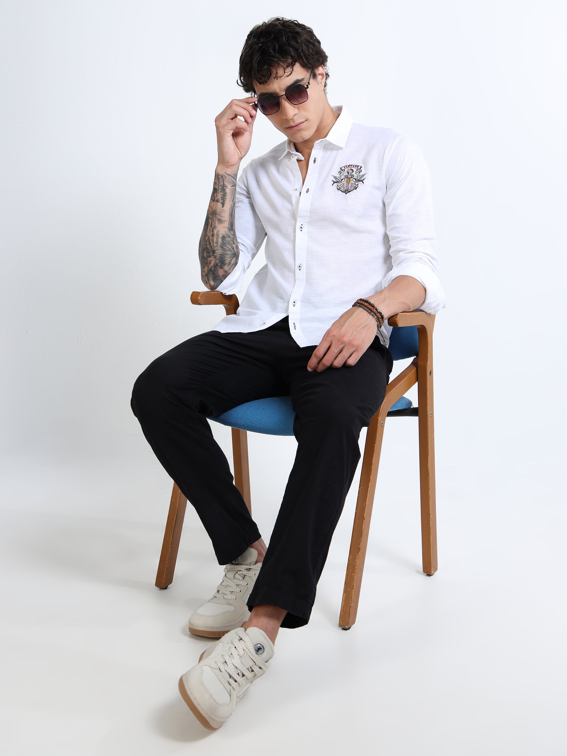 Men’s White Cotton Casual Shirt with Anchor Embroidery Detailing