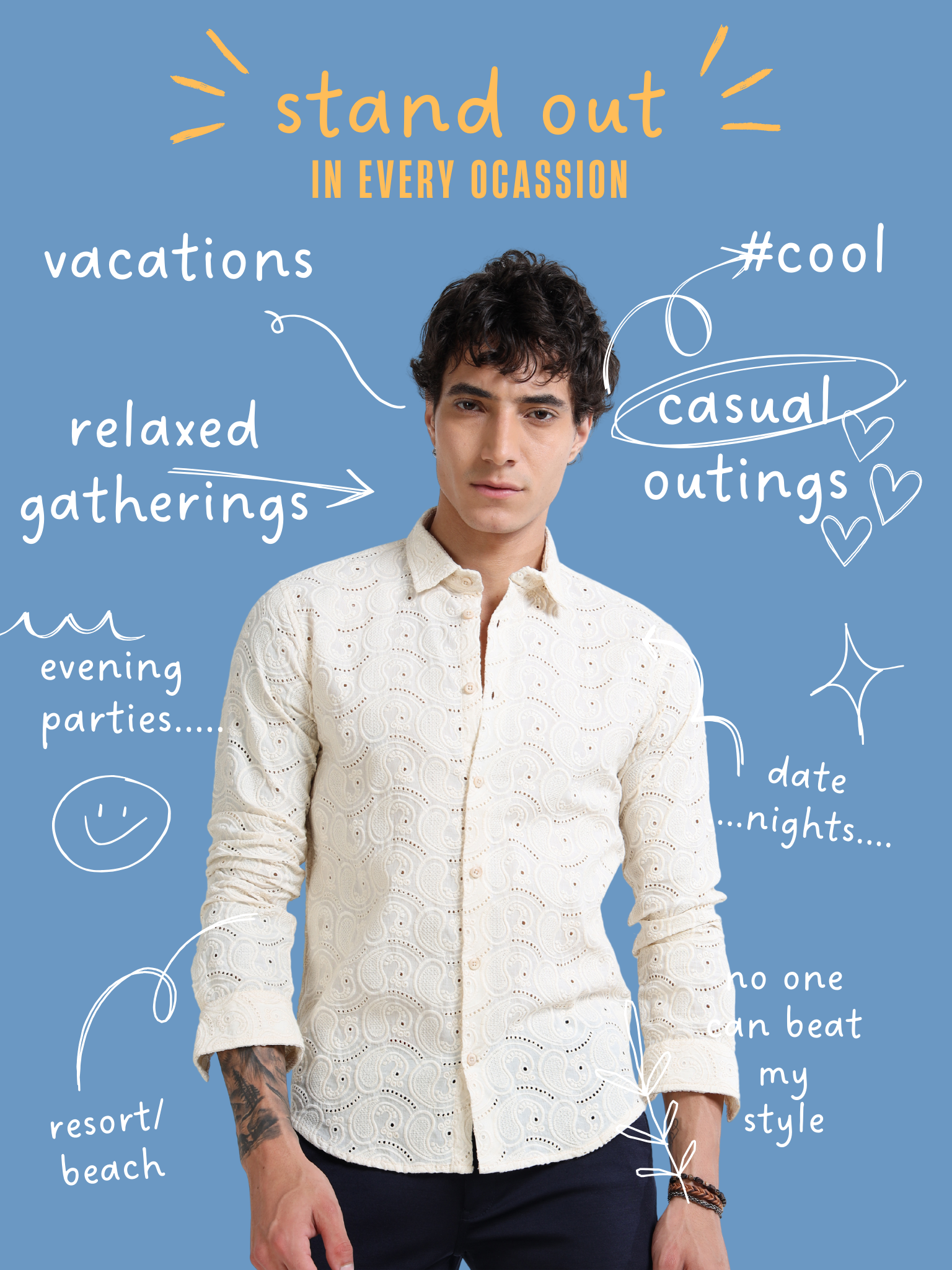 Men’s Cream Cotton Casual Shirt with Paisley Embroidery Detailing