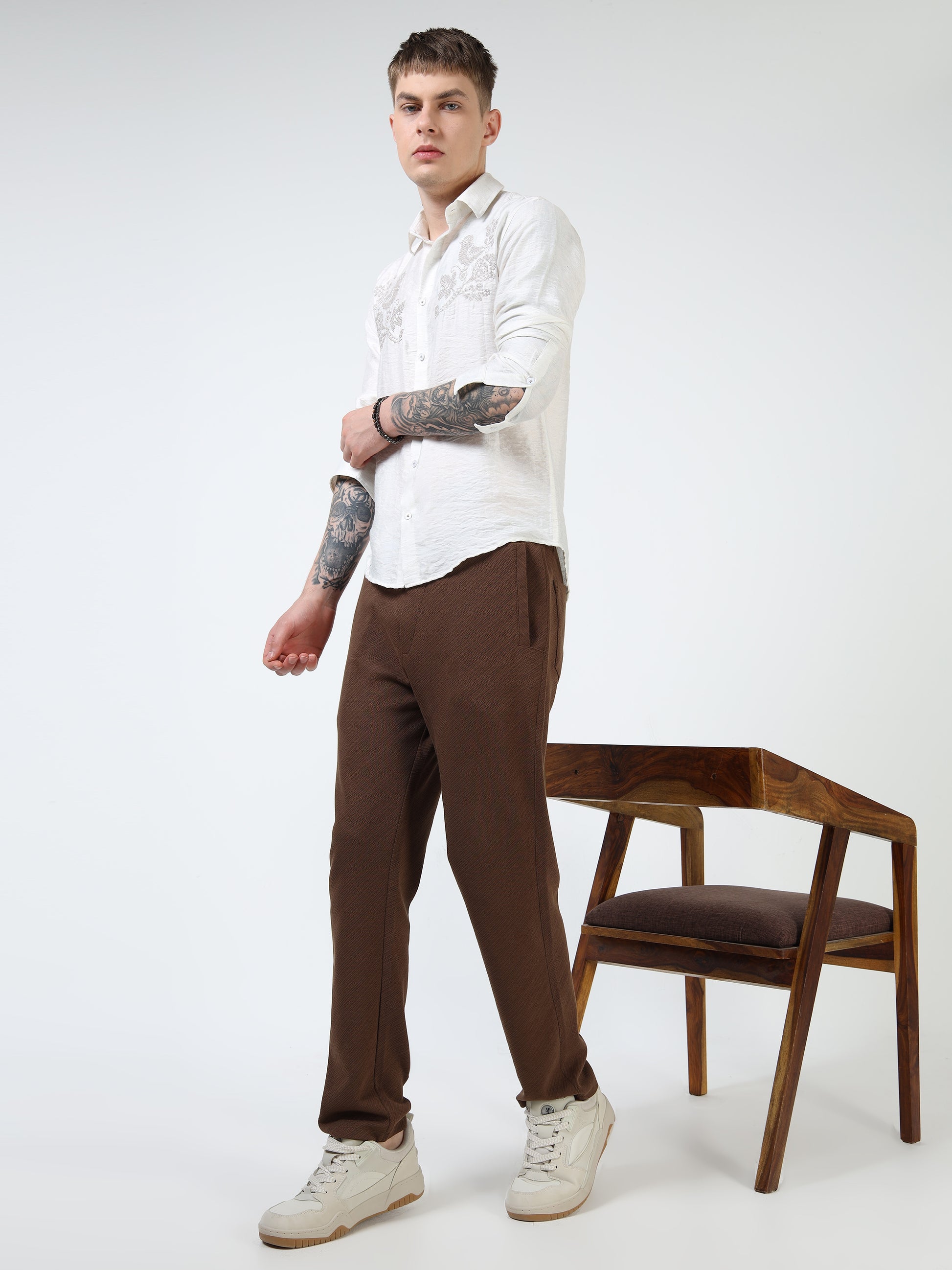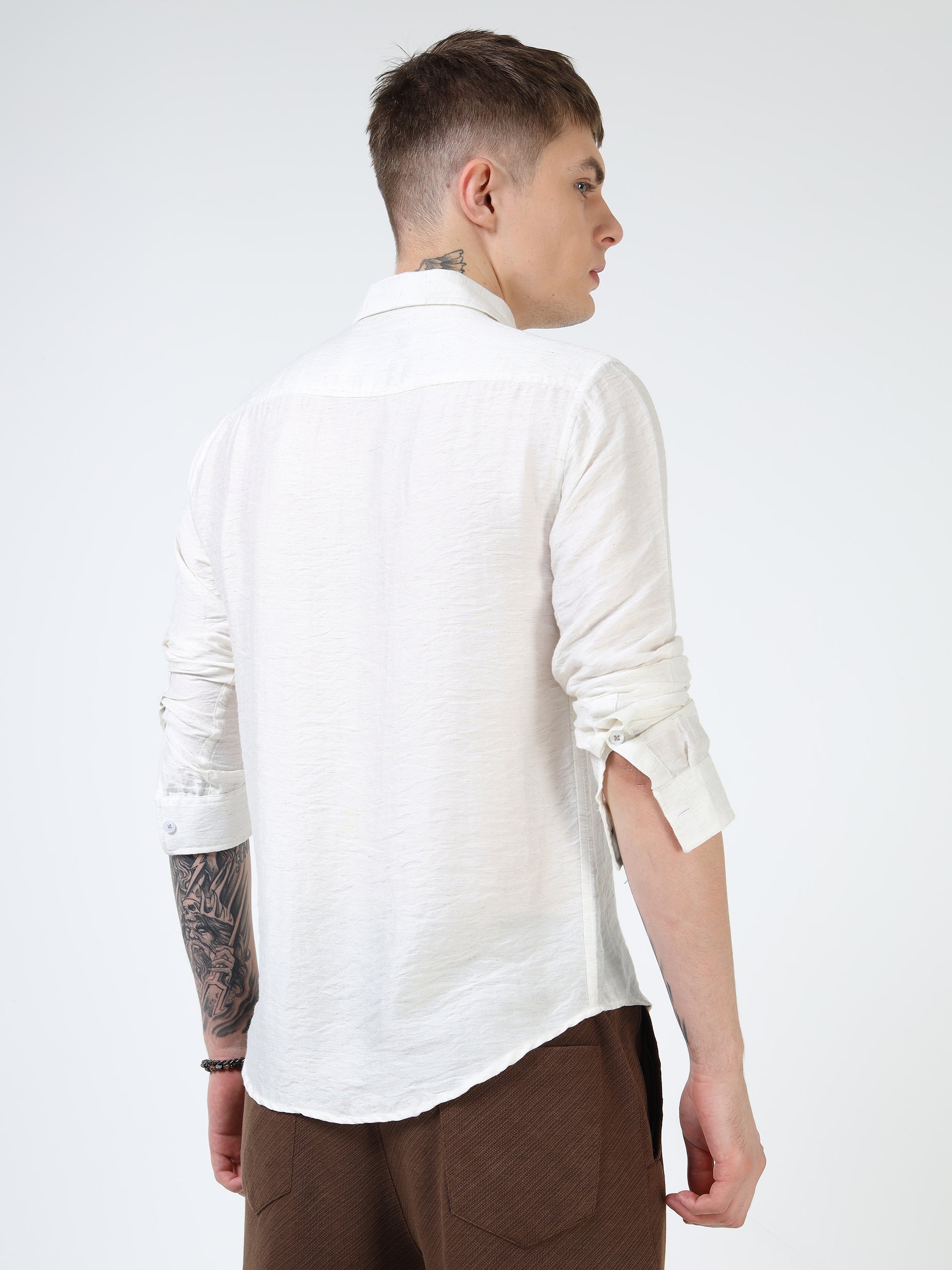 Men’s White Textured Cotton Casual Shirt with Bird Embroidery Detailing